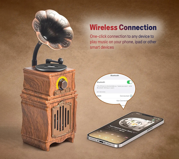 EchoMuse™ Vintage Bluetooth Speaker connects instantly to your phone, tablet, or smart device with Bluetooth 5.3 technology. No pairing delays, no complicated setup—just tap and play. Whether you're streaming music, podcasts, or audiobooks, EchoMuse™ delivers rich, uninterrupted sound with a touch of vintage charm.