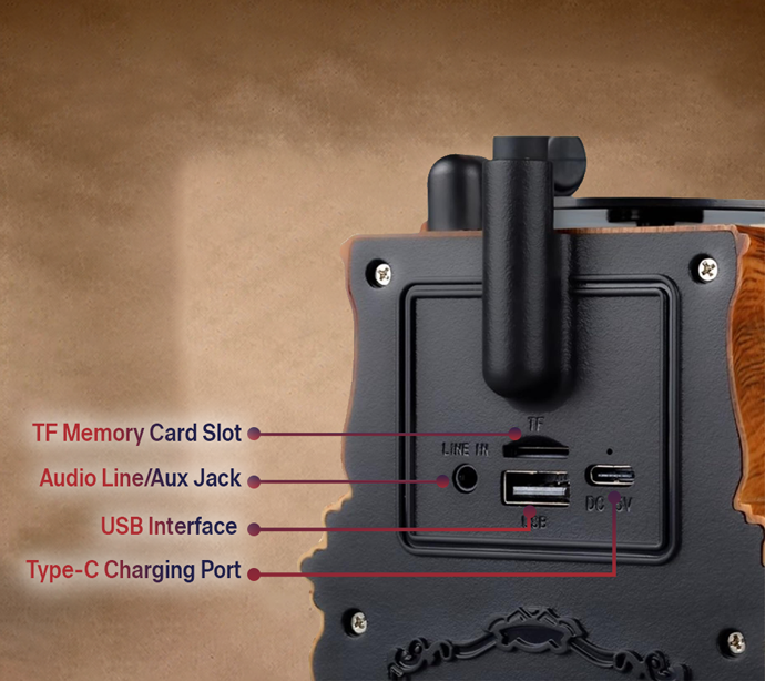 EchoMuse™ Vintage Bluetooth Speaker offers multiple input ports including USB, AUX, TF card, and Type-C charging. Whether you’re plugging in a playlist or charging on the go, EchoMuse™ adapts to your lifestyle with flexible, modern convenience.