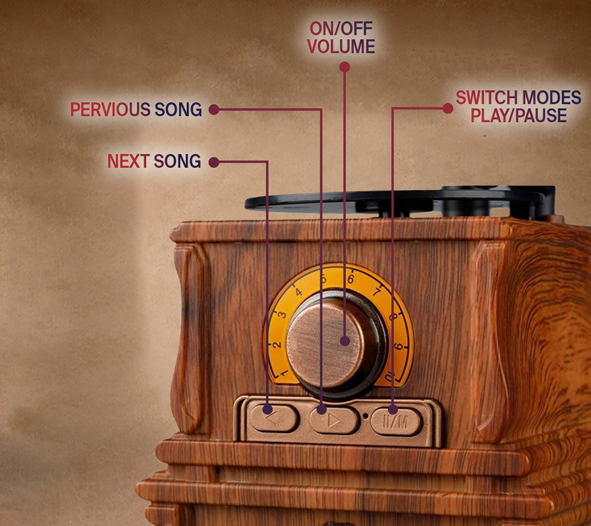 EchoMuse™ Vintage Bluetooth Speaker makes control effortless. With clearly labeled buttons for previous/next track, play/pause, and mode switching, you’ll navigate your music with ease. The central rotary knob adds a tactile, vintage feel to every interaction.
